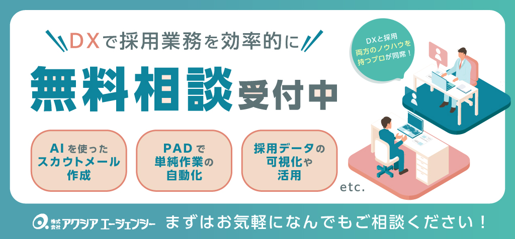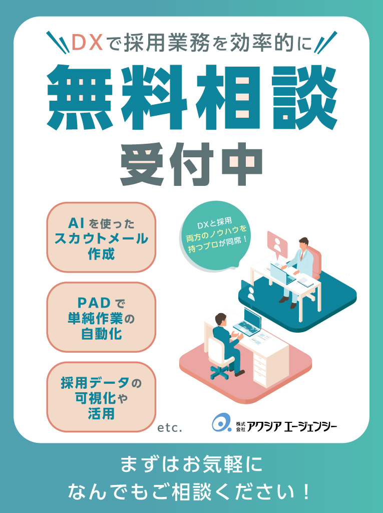 アクシアエージェンシーでは、採用業務のDX化を通じて、業務効率化はもちろん、母集団形成や採用コスト削減など多面的な支援を行っています。課題整理から導入後の改善サポートまで対応可能ですので、採用に関するお悩みがあればぜひご相談ください。