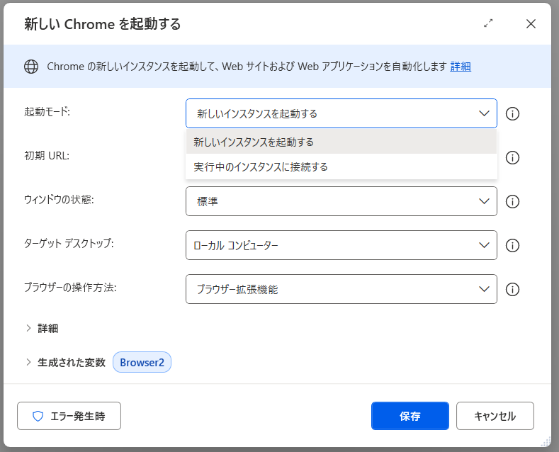 「新しいChromeを起動する」は、Chromeを起動し、PADから操作可能な状態にするアクションです。