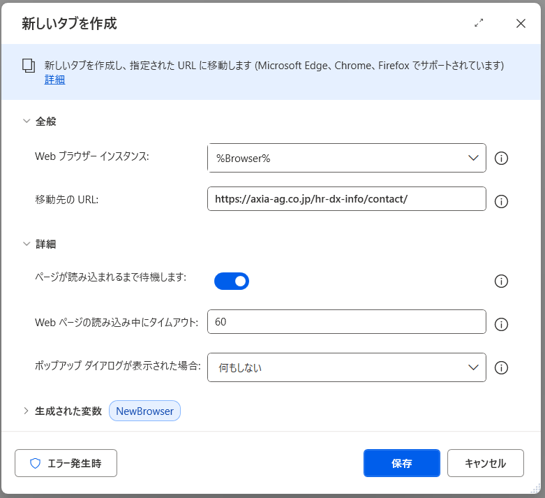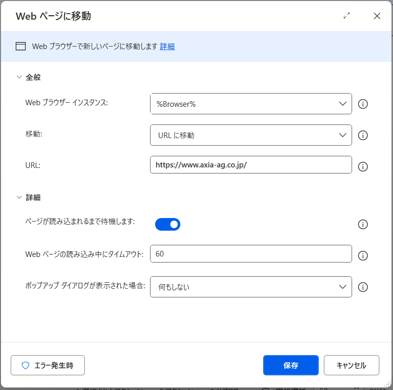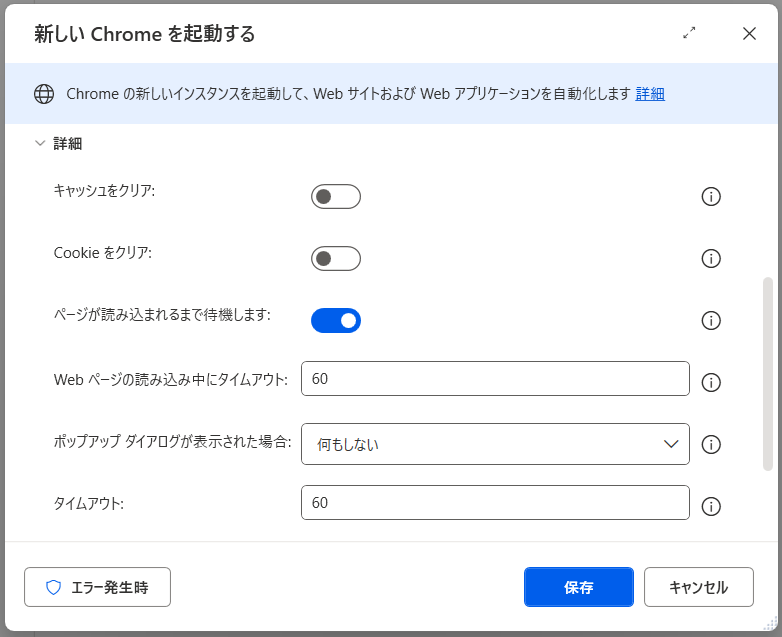 詳細画面の「ページが読み込まれるまで待機します」を有効にすると、ブラウザが起動し、ページの読み込みが完了するまで次の処理へ進まないよう制御できます。