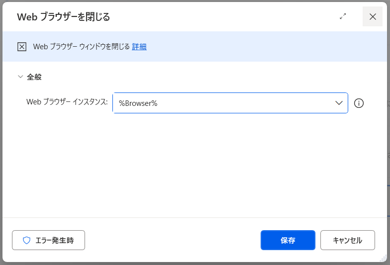 指定したブラウザが閉じられ、フロー内でのブラウザ操作が終了します。
