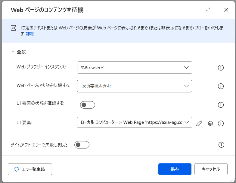 「Webページのコンテンツを待機」は、ページの状態が特定の条件を満たすまで処理を停止するアクションです。