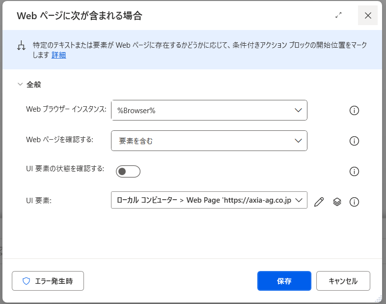「Webページに次が含まれる場合」は、指定した要素やテキストがページ内に存在するかどうかを判定し、処理を分岐するアクションです。「Webページのコンテンツを待機」と同じく、条件にはUI要素を指定する方法とテキストを指定する方法があります。