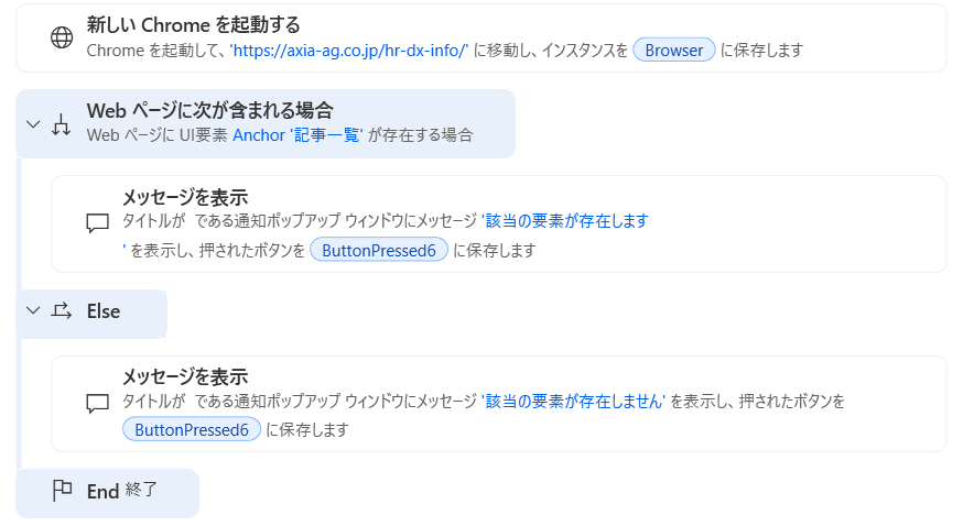 以下のフローを実行すると、ページ内に「記事一覧」の要素が含まれているため真の条件が成立し、指定したメッセージが表示されます。