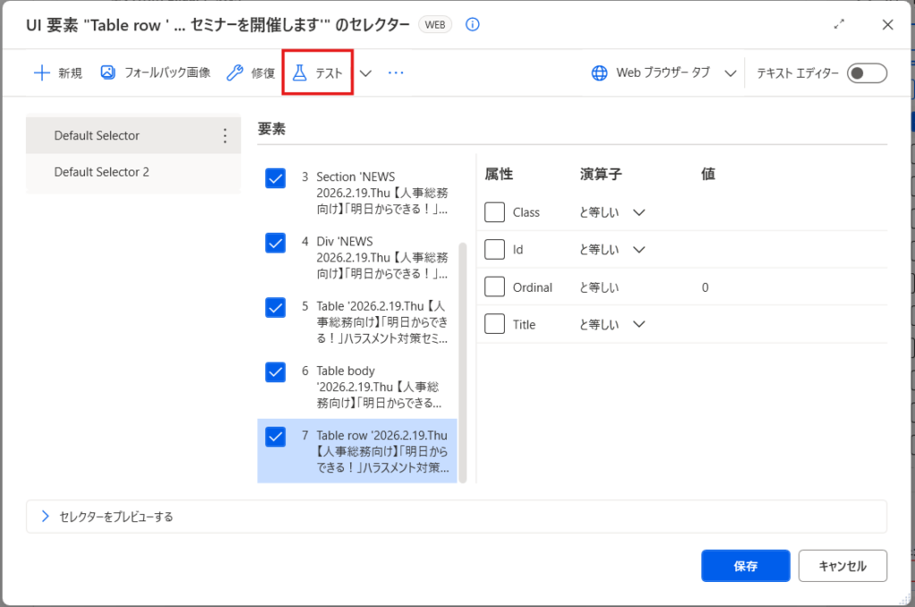 - 「テスト」をクリック: セレクターエディター内の「テスト」ボタンを押します。