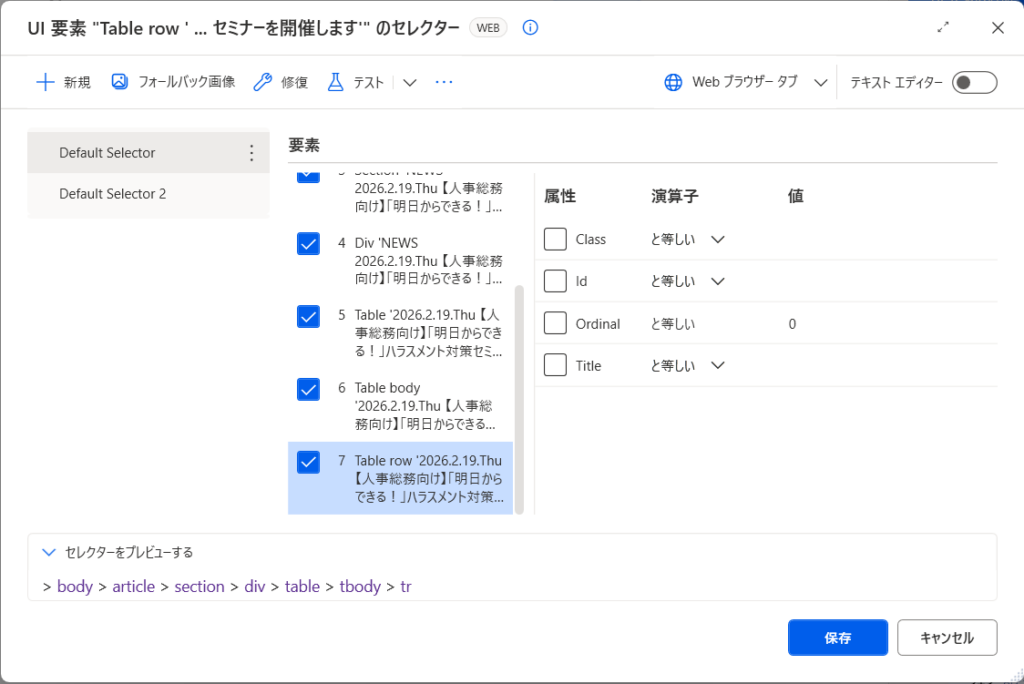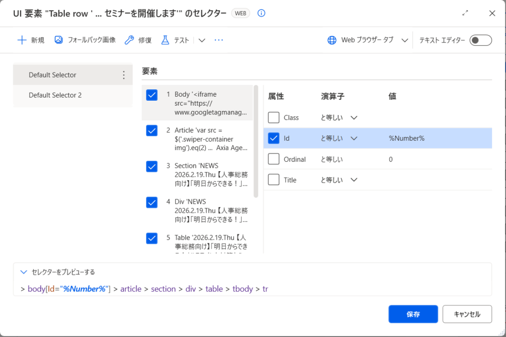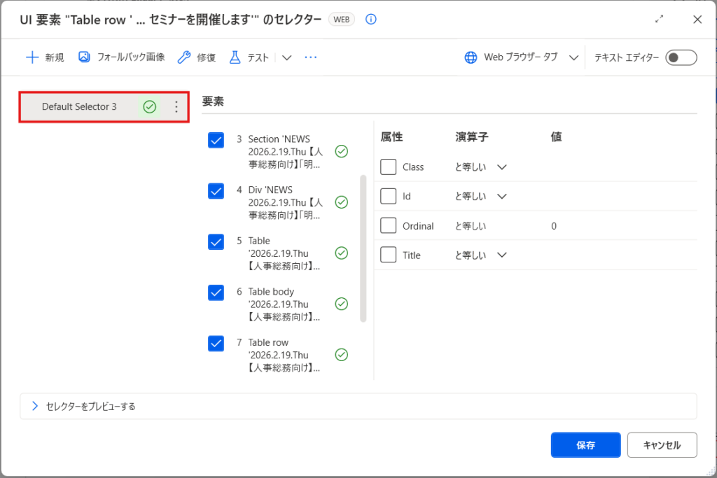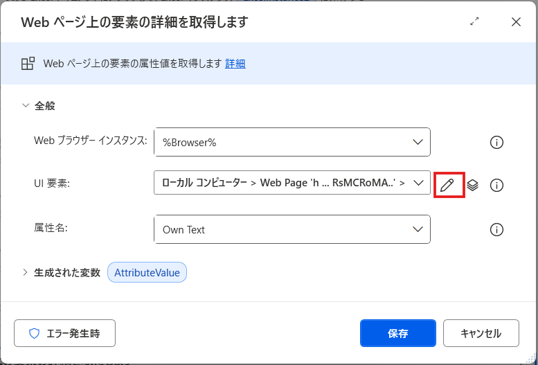 例えば、ページを開くたびに変わるIDなどが含まれていると、フロー実行時に要素を見つけられなくなる可能性があります。