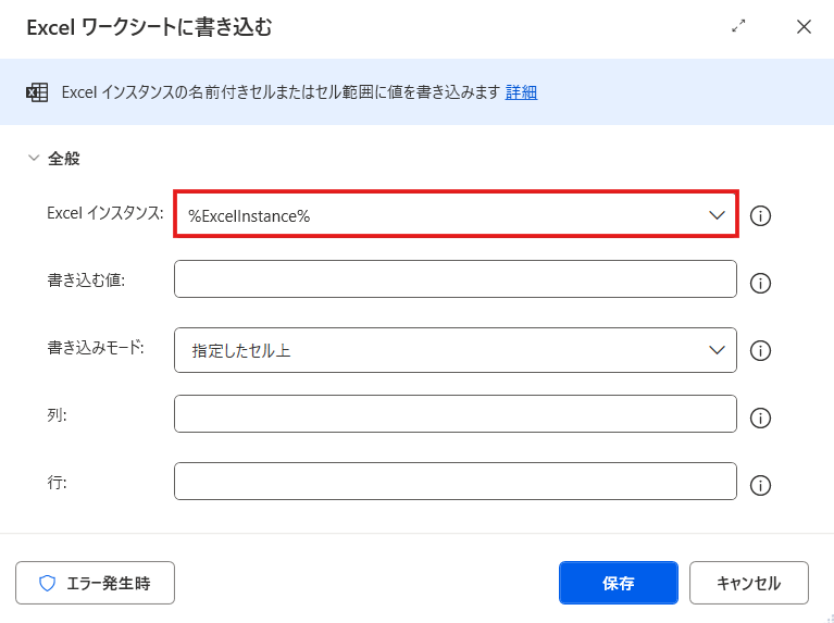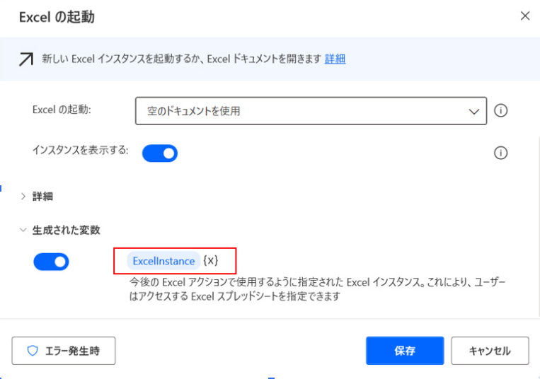 Excelの保存やセル操作など、後続のExcel関連アクションでは、どのExcelファイルを操作するかを指定する必要があります。その際に、ExcelInstance を指定することで、同じExcelファイルを継続して操作できます。