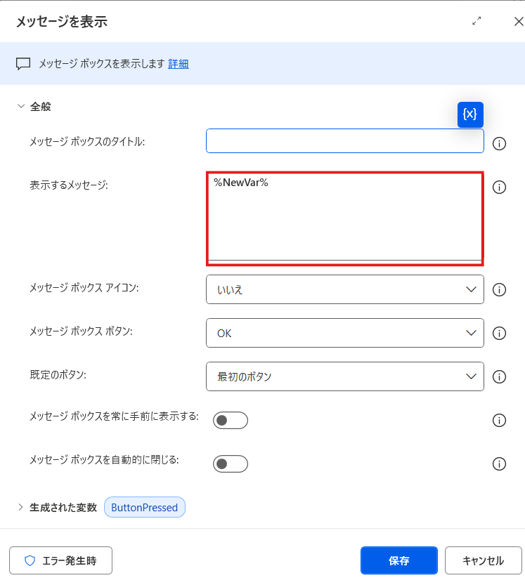 2.「メッセージを表示」アクションで、表示するメッセージに%NewVar%を指定します。