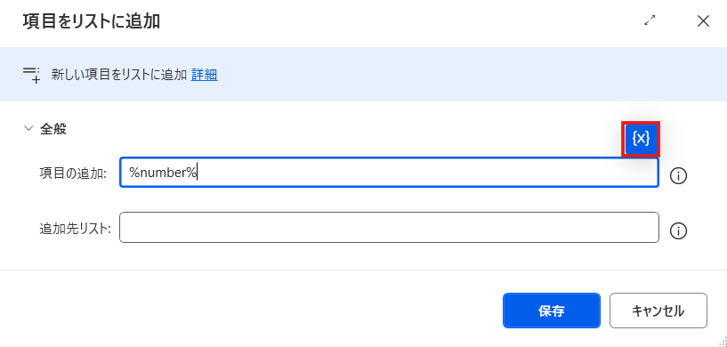 アクションの入力欄で変数を使用する場合は、入力フィールド横の{X}をクリックして選択するか、直接入力することも可能です。変数は「%」で囲まれているのが特徴です。