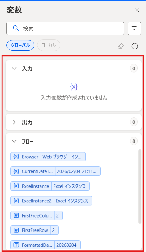 作成された変数は、画面右側の変数ペインで確認・管理できます。変数ペインには、「入出力変数」と「フロー変数」が表示されます。
