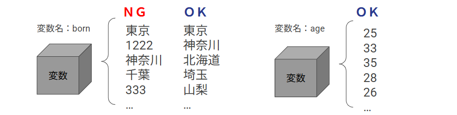 異なる型や用途のデータを同じ変数に代入すると、エラーや想定外の結果の原因となるため、変数は用途ごとに分けて作成しましょう。