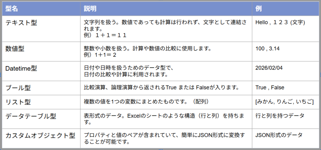 変数には、格納するデータの種類(数値、テキスト、データテーブルなど)に応じた「データ型」が存在します。