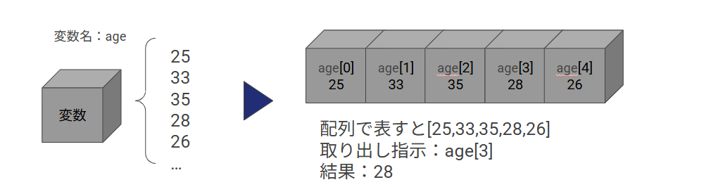 age[3] を指定すると、4番目の値である 28 が取得されます。
