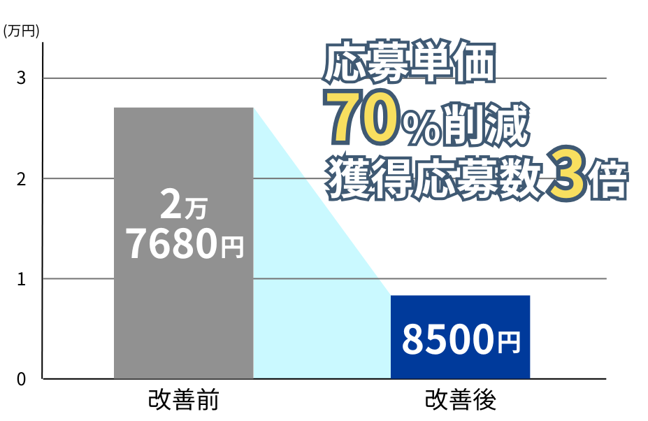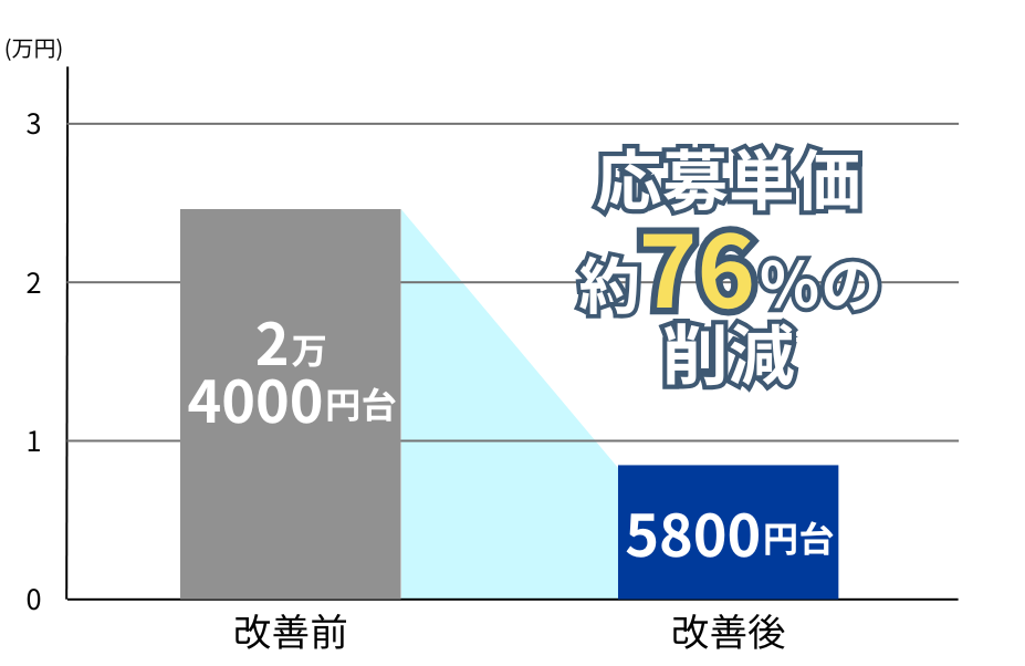 応募単価2万7680円から8500円へ大幅削減!獲得応募数も3倍になり、採用効率・費用対効果の改善につながった事例です。
