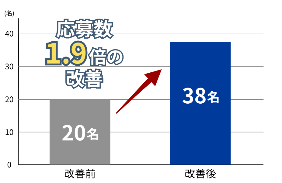 改善前と同予算で1ヶ月20名から38名へ増加!応募が集まりづらい深夜勤務の案件ながらも1.9倍の改善に成功しました。