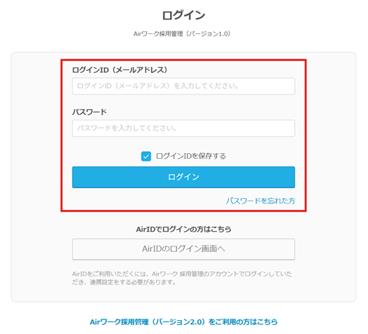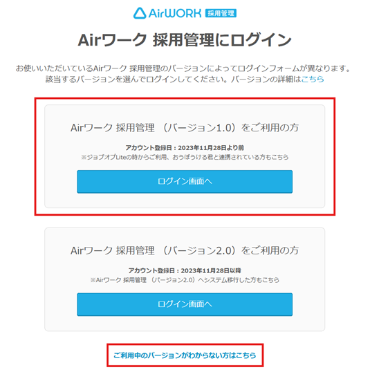 <ログインページ>https://ats.joboplite.jp/login_selection - 「Airワーク採用管理(バージョン1.0)をご利用の方」の「ログイン画面へ」をクリック。