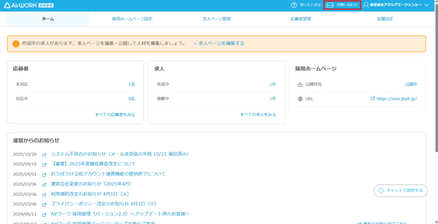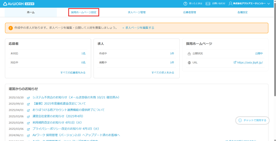 - Airワーク採用管理の管理ページへログイン。