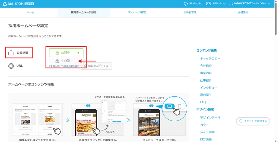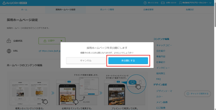 「採用ホームページ設定」の「公開状況」を「非公開」へ変更。「非公開にする」をクリックし完了です。