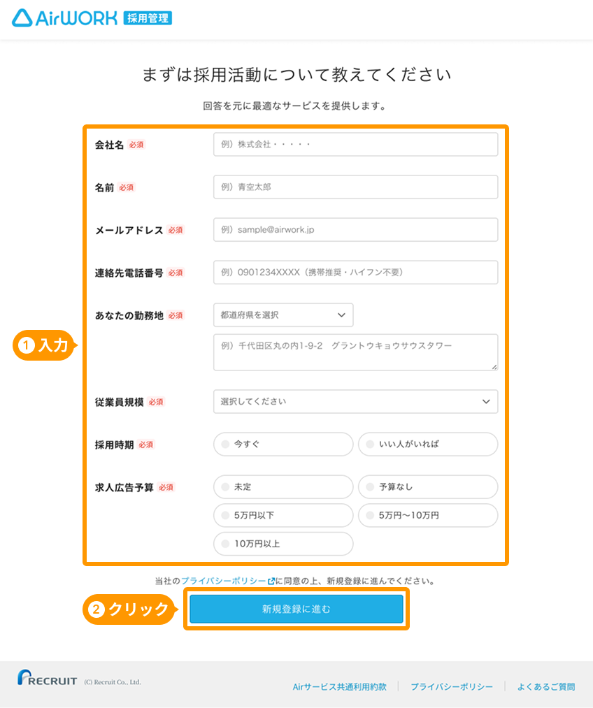 1-② 貴社の採用状況等を入力し、「新規登録に進む」をクリック。