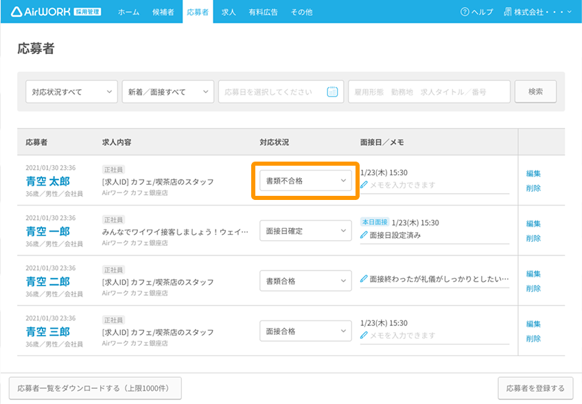 - 応募者ごとの情報を分かりやすく整理・管理
