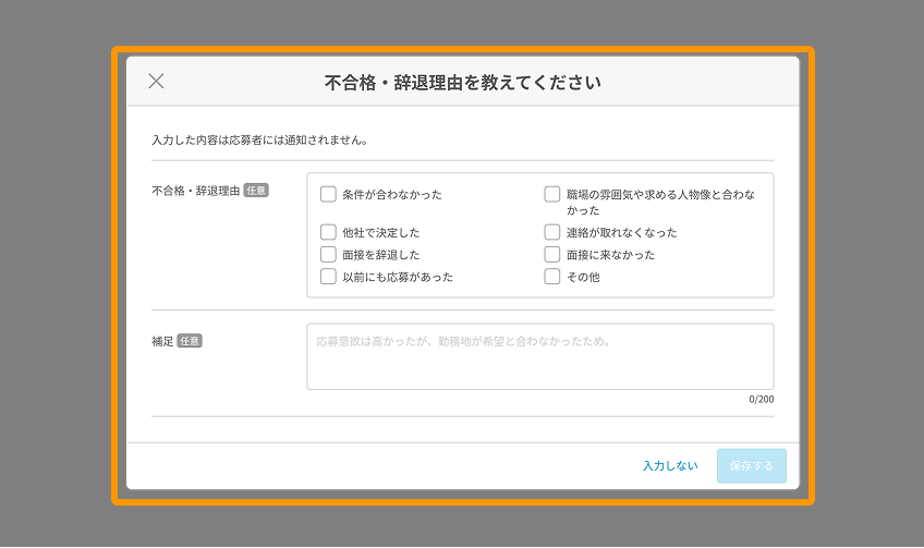 - 不合格および辞退の理由を個別に入力可能