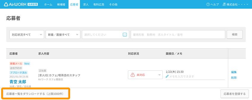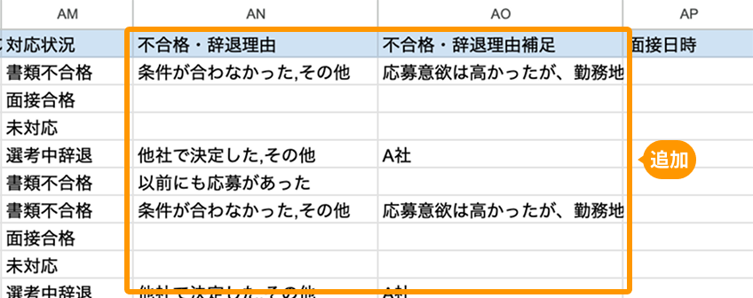 - 応募者一覧をダウンロードする際にも「不合格・辞退理由」の項目が追加されます。