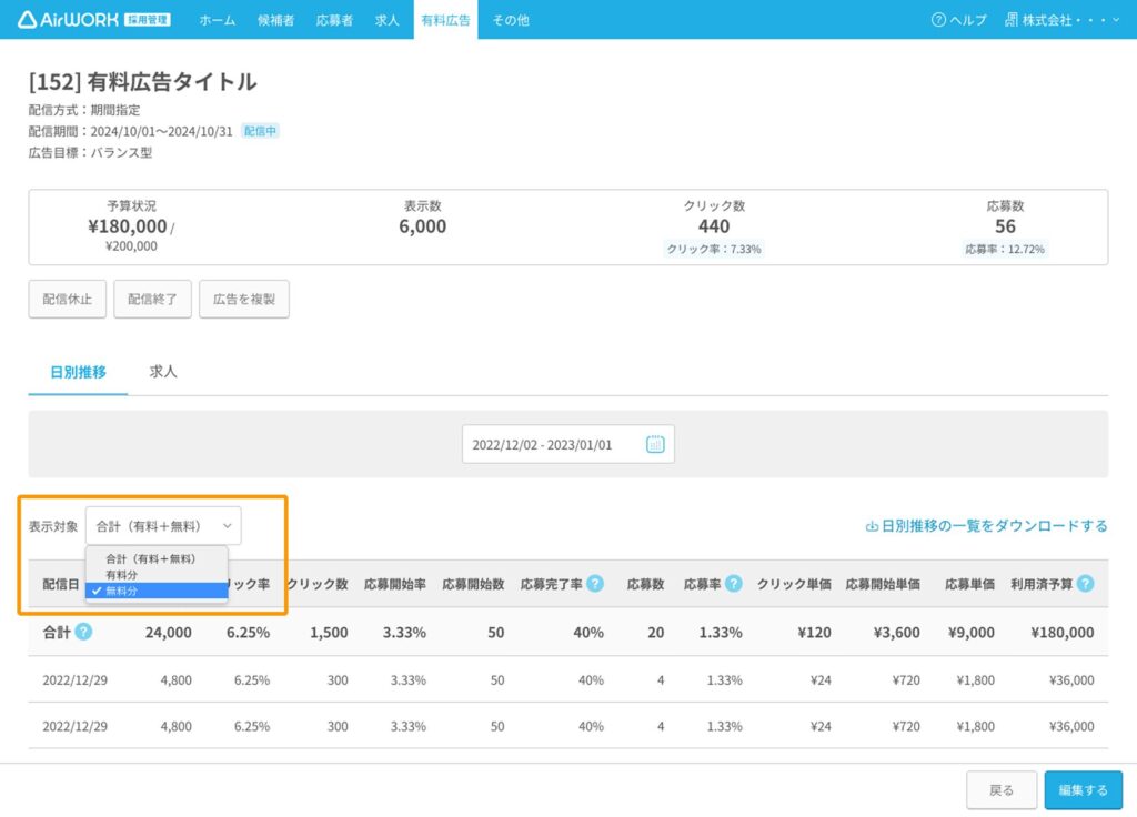 これまで有料広告分のみ確認できていた表示数・クリック数・応募数・応募単価といった閲覧レポートですが、