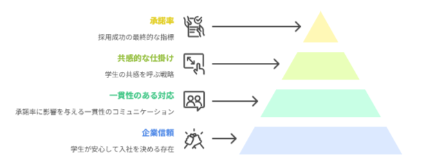 給与や条件だけでなく、人や社風、成長環境といった定性的な価値を伝え、学生が「ここで働きたい」と心から思えるようにすることが重要です。このフェーズを丁寧に設計することで、承諾率を高め、入社後の定着にもつながります。