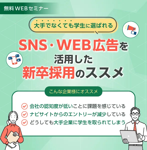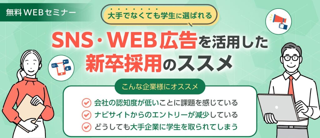 多くの企業が競合他社と同じナビサイトや合同説明会に出稿する中で、「他社と比較される前に学生と接点を持ちたい」と考える企業も増えてきました。その答えのひとつが、SNSとWEB広告を活用した独自ルートの確立です。これは、母集団形成の中でも最も戦略性が問われる領域のひとつです。
