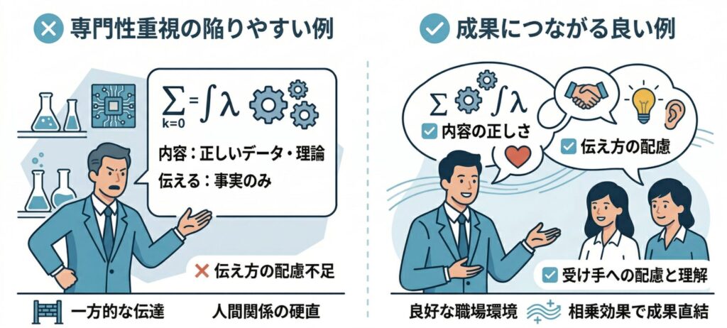特に専門性の高い職場では、「内容として正しいことを伝えている」という意識が強くなりやすく、伝え方や受け取り方への配慮が後回しになりがちです。しかし、実際には伝え方が関係性や職場環境に与える影響は大きく、結果に直結する重要な要素となります。