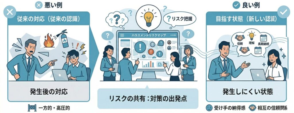 このような点を踏まえると、ハラスメント対策は「問題が起きた後の対応」だけでなく、「問題が起きにくい状態をつくること」まで含めて検討する必要があります。リスクとしての認識を組織内で共有することが、対策の出発点になるのです。