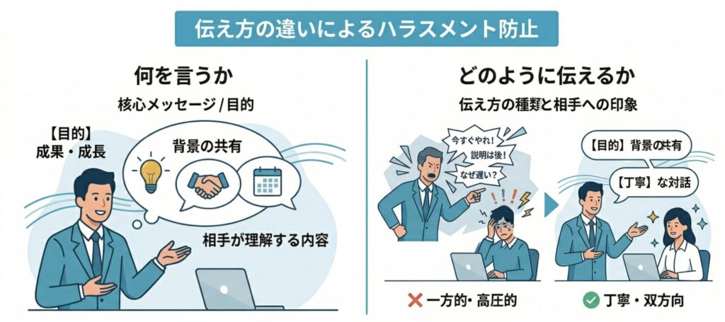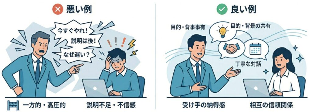 例えば、業務を円滑に進めるための指示であっても、伝え方によっては一方的・高圧的に受け取られてしまうことがあります。また、忙しい現場では説明が不足したまま指示が出されることもあり、受け手側に不信感やストレスを与える要因となります。