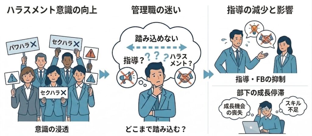 一方で、ハラスメントを過度に意識するあまり、必要な指導を避けてしまうケースも見られます。その結果、部下が適切なフィードバックを得られず、成長機会を失ってしまうといった新たな課題も生じています。