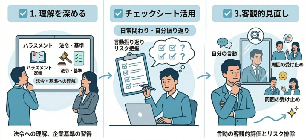 ハラスメントの定義や法令、企業として求められる基準について理解を深めた上で、チェックシートを活用しながら、自身の日常的なコミュニケーションや関わり方を整理します。