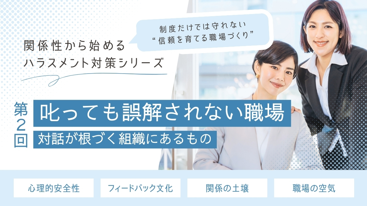 このシリーズでは、関係性の質に目を向けることが、組織を本質的に守るハラスメント対策につながるという視点から、現場で起こるすれ違いや、信頼関係の築き方、実践につながる対話のあり方を5回にわたって掘り下げていきます。