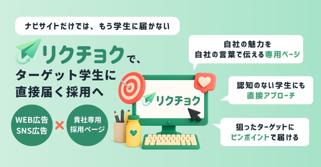 ナビサイトだけでは出会えない学生層に、直接アプローチできるのが「リクチョク」です。WEB広告・SNS広告と専用採用ページを組み合わせることで、認知拡大からエントリーまで一貫してサポート。母集団形成の課題を解決へ導きます。