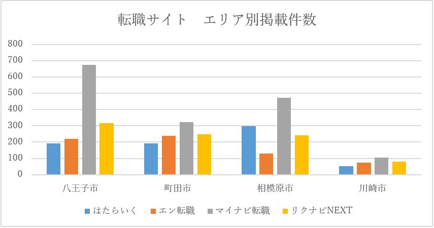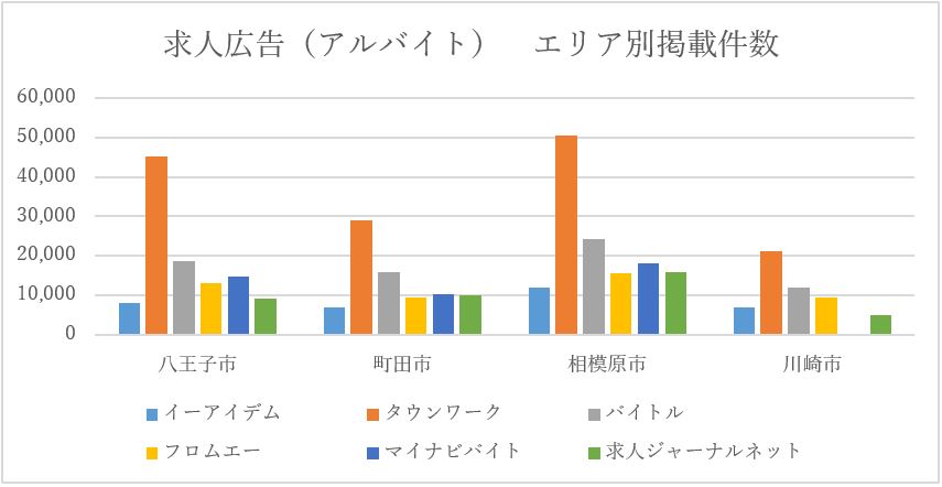 下記のグラフはどの求人広告が利用されているのかをエリア別に分けたデータです。同じ八王子市、町田市、川崎市麻生区、川崎多摩区、相模原市エリアであっても、それぞれの市によって利用されている媒体が異なることが分かります。
